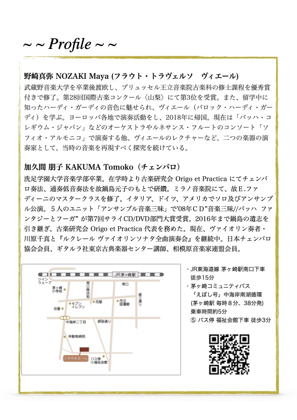 フラウトトラヴェルソ/ヴィエール奏者として大活躍の野崎真弥さんとの演奏会!2回公演です