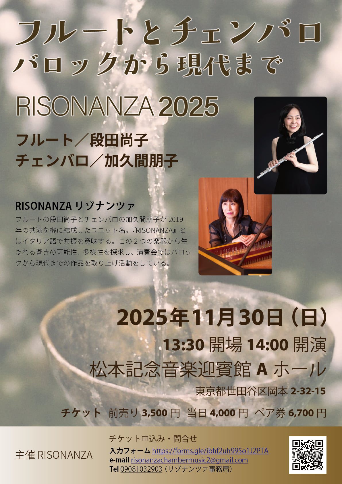モダンフルートとチェンバロでの演奏会 フルートの段田尚子さんと『リゾナンツァ』というユニット名で活動しています。バロックから現代の作品まで取り上げていて、今回は世界初演となる高畠亜生氏の作品「隠陽組曲」もお楽しみに!!
