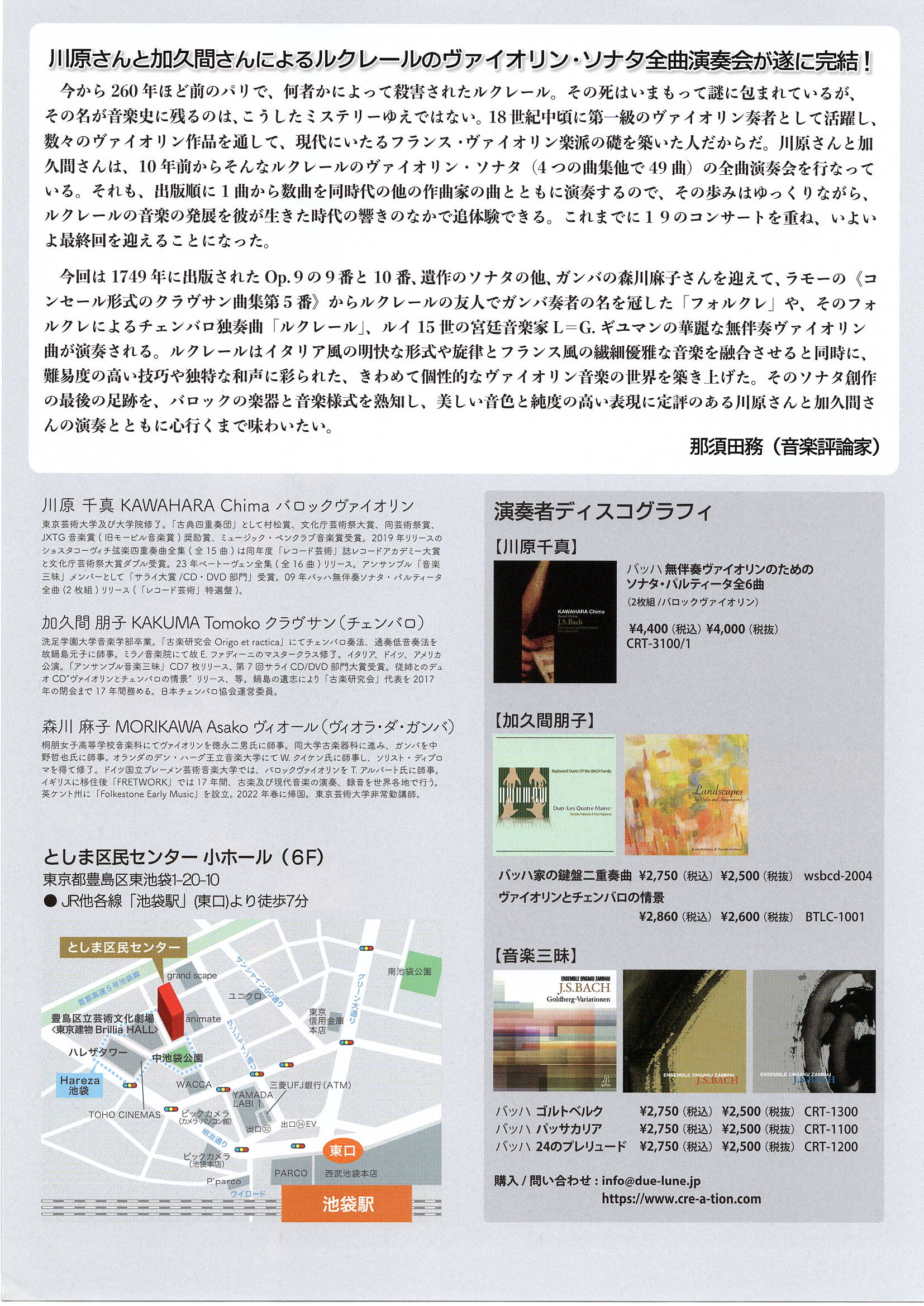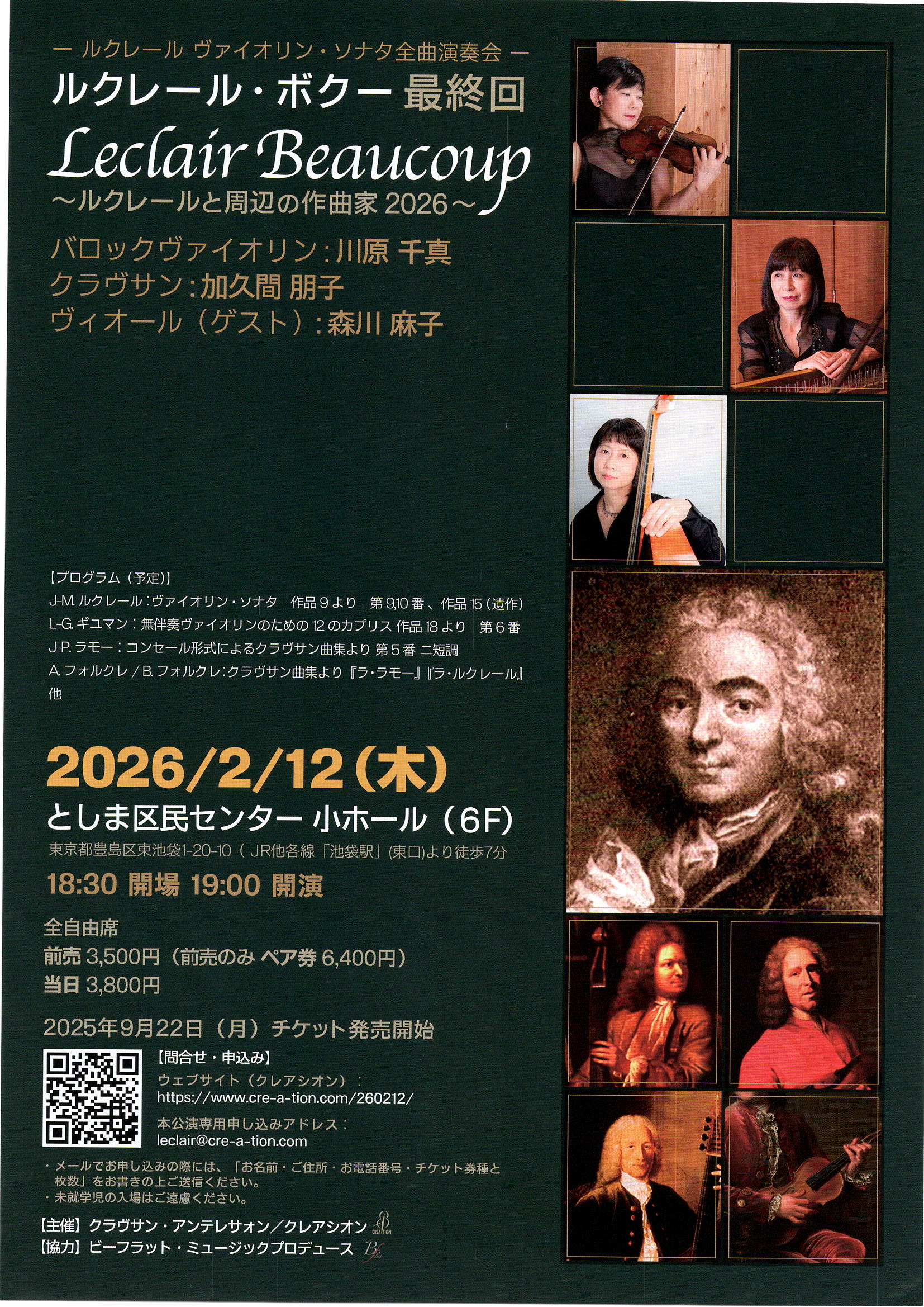 ◉ルクレール・ボクー ルクレールのヴァイオリン・ソナタ全曲演奏 第6回2022年8月12日(金)としま区民センター6階 川原千真体調不良により延期となりました。2023年8月に公演予定です!